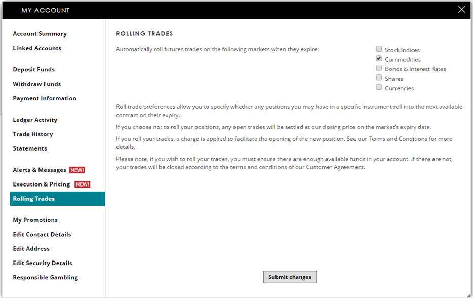 All spot commodity trades will automatically remain open indefinitely. Futures trades will close at the expiry date of the contract. You can specify whether you would like to roll any commodity futures trades to roll into the next contract by visiting the Rolling Trades page within My Account once you have logged in. Click the following link to find out information on setting your Trading Preferences. You can find the expiry date of each futures contract on the information button on our platform.
