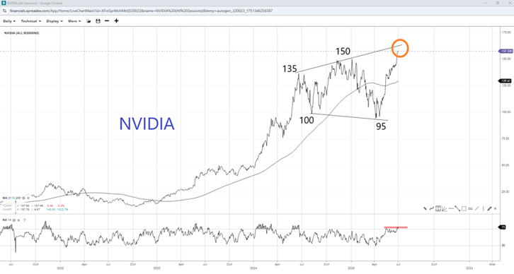 Markets are expecting the Fed to cut sooner and faster, potentially as soon as a new Fed Chair is nominated, as the "Shadow Fed" concept has sparked speculation about lower rates. Meanwhile, Trump’s move might be an attempt to undermine Powell, who has been reluctant to cut rates. Still, markets are already pricing in around five rate cuts after May 2026, when Powell's term is set to end. Lower rates are expected to support higher-valued stocks, such as NVIDIA, which hit an all-time high on Friday. However, its “megaphone” pattern suggests potential resistance around $175.