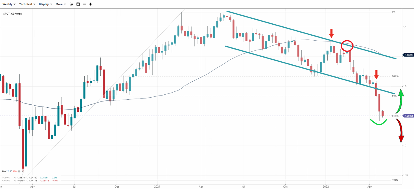 GBP/USD’s downward trend accelerated a couple of weeks ago when the fx pair broke outside the descending channel starting on June 1st ’21. That came following a rejection at the 200-week average on Jan 10 ’22 and a second weak attempt a few weeks later.