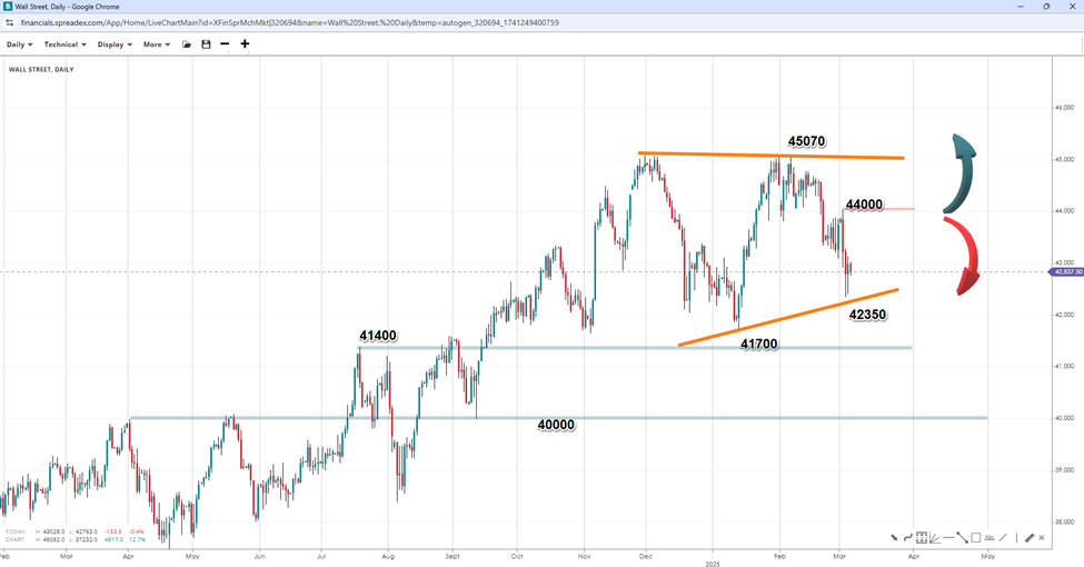 Despite recent declines, the Dow Jones appears to be forming a pennant or triangle pattern, suggesting a potential measured-move projection towards 48,500 in the longer term if the 44000 and 45070 resistance levels give way to bullish price action. Conversely, a reversal below the regional support at 42350, followed by a break of 41700, could invalidate the pattern, transforming it into a bearish flag and signalling a double top formation. This would increase the chances of a potential bearish continuation towards 41400 and the 40000 handle.