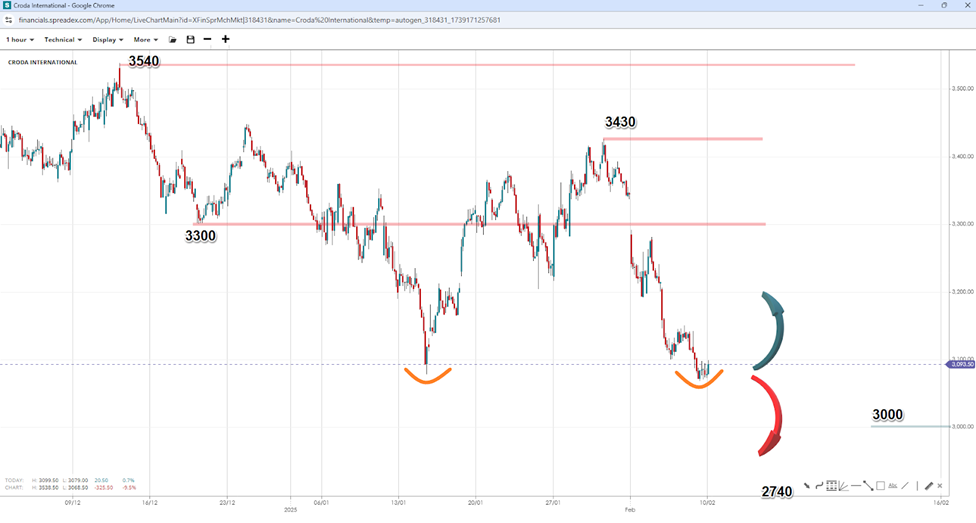 The speciality chemical company's stock has formed a double bottom pattern at 3080 GBX in the short term, supported by a larger pattern at 3000 GBX dating back to May 2016. Should the 3300 GBX support break, it could open its door to higher levels with a reversal potentially seeing prices rally towards the 3430 and 3540 GBX swings in the near term. However, if the stock loses support at the round level, traders might wait for a breakdown towards the 2745 GBX floor formed in March 2013 to determine the next move.