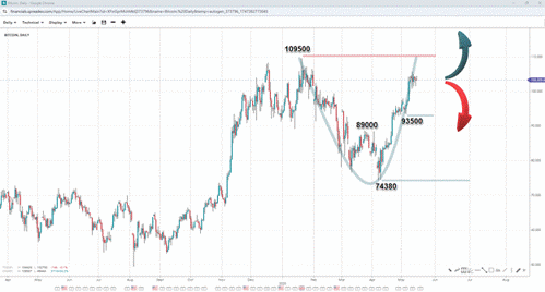 Bitcoin's gradual descent from $109500 to the $74380 low and its subsequent ascent might form a bullish cup and handle pattern, with the cup rim initially reclaiming the record peak. As BTC consolidates in a U-shaped formation between the peak and the rounded bottom, a break higher could propel prices to the psychological levels of $115K and $120K, with the measured-move target of the potential C&H pattern eyeing $145K. Meanwhile, if triple-digit support at $100K is lost and bulls give way to $93500, flipping $89K would expose the 2025 low once again, eventually terminating the bull market cycle.