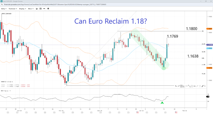 Last week, the EURUSD was trending lower as the odds of a Fed rate cut this quarter diminished in the wake of better than anticipated economic data. But US President Donald Trump's announcement that he would impose tariffs on certain European allies if they didn't support his ambitions on Greenland sent the dollar lower and the euro higher. Investors worried about exposure to US markets worried that last year's "sell America" trade in the wake of the "Liberation Day" tariffs would repeat. Yields on US debt rose as investors sold US assets amid concerns about prolonged uncertainty and the potential acceleration of the de-dollarisation trend. However, analysts note that the market is still doubting that tariffs will be imposed at the start of next month, hoping for a de-escalation or resolution of the Greenland issue by then. Trump will be in Europe for the WEF Conference and is expected to meet with multiple European leaders, including some of those he'd threatened with tariffs over the weekend.
