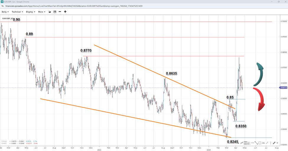 Despite Cable nearing a 3-year high, the pound is falling against the euro, with the EURGBP pair reaching its highest level since November 2023 as traders price in the potential for more rate cuts from the BOE this year. Softer-than-expected inflation figures in March are driving this expectation. While inflation is expected to pop back up in April due to regulated utility price increases, the latest figures were below the 3% level that the BOE expects inflation to remain above for the rest of the year. The tariff disruption could cause companies to send cheaper goods, which are affected by levies in the US, and contribute to lower inflation in Britain in the coming months.