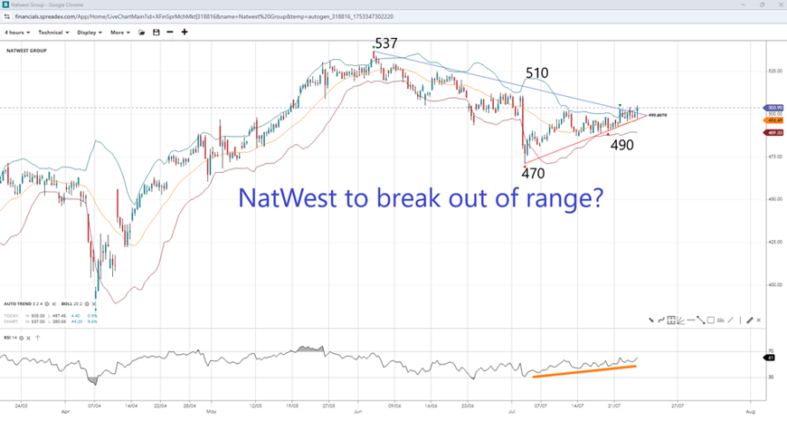 NatWest's share price continues its recovery from the early July drop to £470, with the RSI still not reaching overbought territory. A follow-through could find resistance at the month's high of £510 per share, with a break higher exposing the 2025 high of £537. On the flip side, if price action turns lower, it could encounter support at the recent low, which coincides with the lower Bollinger Band at £490, followed by the month's low.
