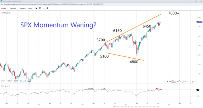 The S&P 500, for instance, trades back at record highs following a blip to 6500, with 6750 opening the door to the 7k handle, while RSI momentum wanes. In what appears to be an open triangle pattern, if the upward movement accelerates towards the upper trendline, a rejection could be the catalyst for a reversal. Major support in the medium term sits at 6150, with an interim level at 6450.