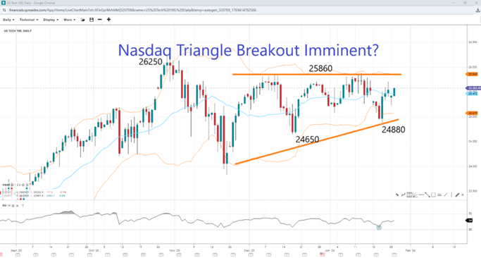 Nasdaq’s narrowing price action to the upside, with higher lows at 24880 and 24650, suggests a complete triangle pattern that could be pending a breakout. The double-top formation at 25860 is the first line of resistance for bulls, aligning with the upper VWAP, with the prior record peak at 26250 next up. Typical extensions measure the opening of the triangle, bringing into focus 27900 in the longer term.
