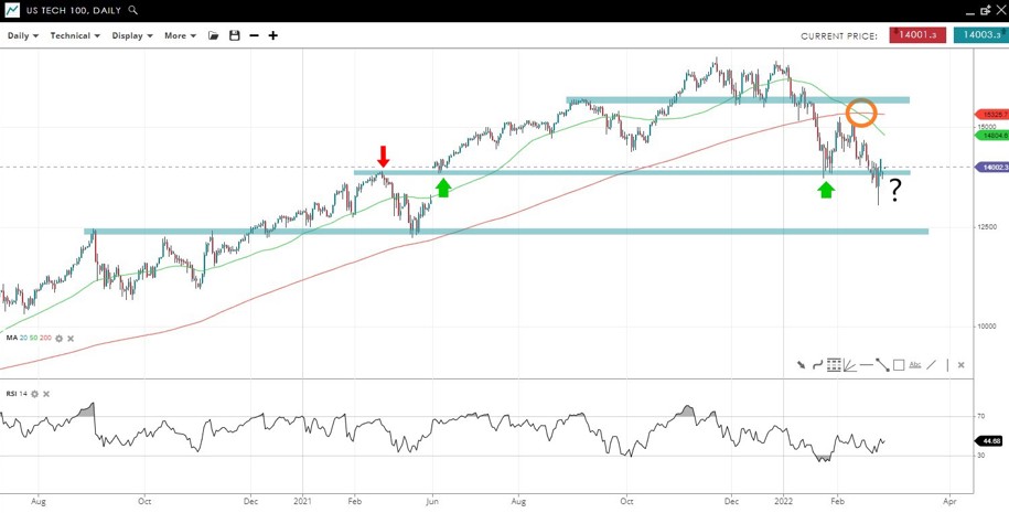 Nasdaq's high concentration of tech stocks means it’s a riskier index that tends to outperform in uptrends and underperform in downtrends – so in the risk-off environment caused by the conflict in Ukraine, it is very much underperforming. But we also need to be mindful of the effect of the current situation within the context of longer-term trends and monetary policy.