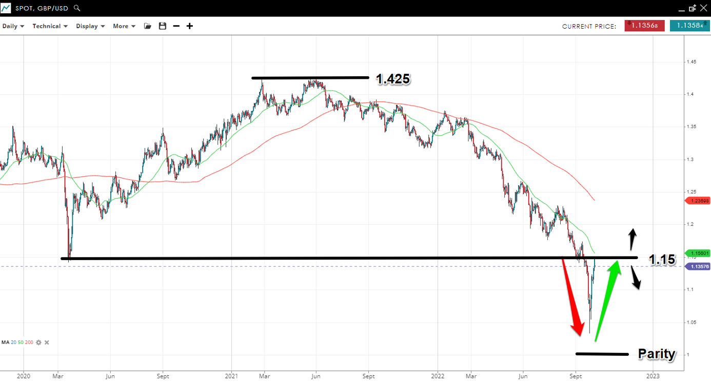 Chancellor Kwasi Kwarteng’s first few days on the job saw GBP/USD hit a record low then rally over 1100 pips (approx. 1.0350 - 1.1500).