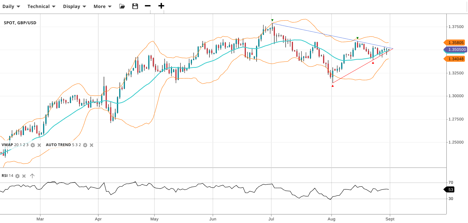 NOTE: These charts use the ‘Pro Trading Tools’ available on the SpreadEx trading platform. To use them, log in to your SpreadEx Financials Account and click ‘Technical’ from the menu on any chart.