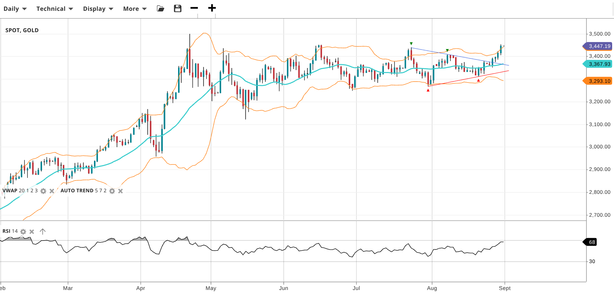 Gold has broken higher, trading at 3,447 above VWAP 3,368 and near the top of its 4-month range. RSI at 68 demonstrates the fresh bullish momentum. Support is 3,293, resistance is being tested at 3,450.