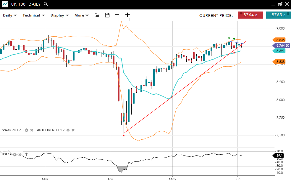 The UK 100 continues in a bullish trend and is in a late-stage impulsive phase. Price is at 8,764.5, above its VWAP of 8,691, showing mild underlying strength. The RSI at 59.1 supports steady momentum. Support sits at 8,538, with resistance at 8,845.