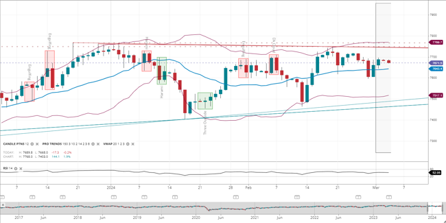 | UK 100 | 7671.5 | Neutral | Consolidation | 7643.4 | 7517.1 | 7769.7 | 52 |