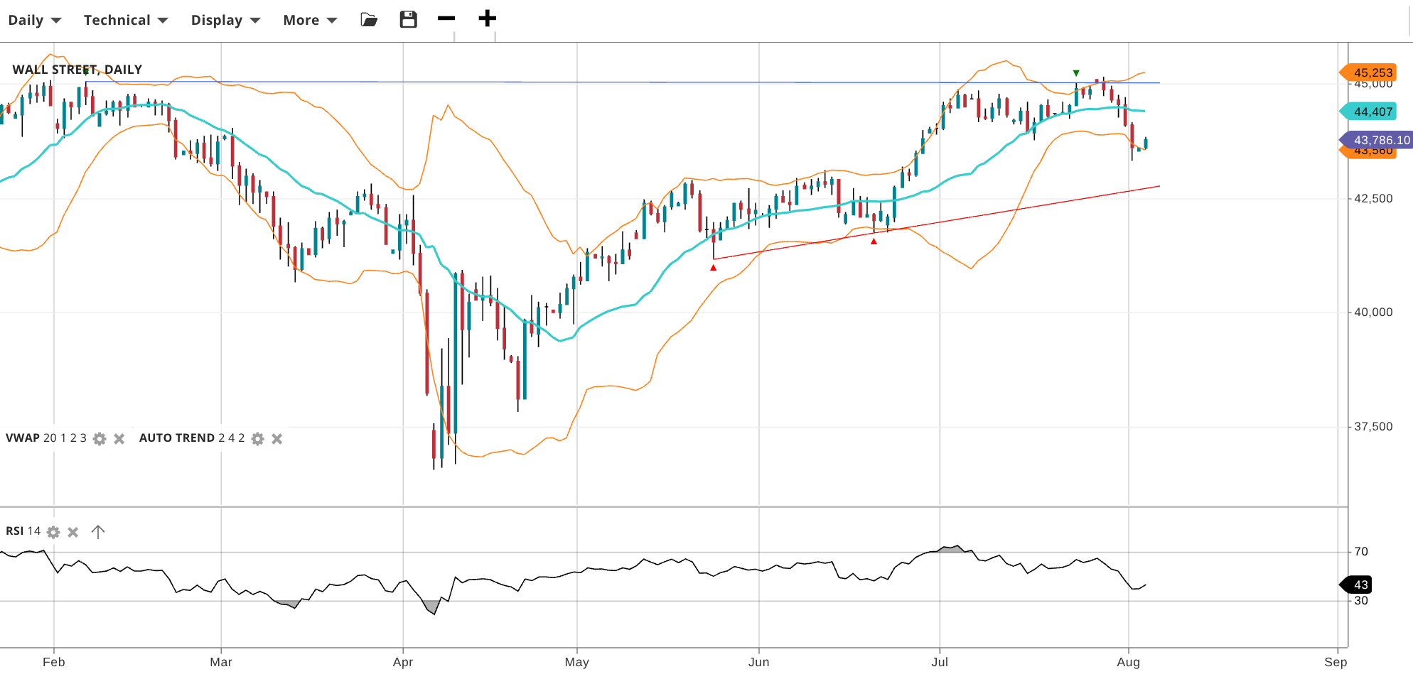 Wall Street remains bullish but is now in a corrective phase. Price has dropped to 43,786, below its VWAP of 44,407. The RSI of 43 highlights growing downside pressure. Support is at 43,580, and resistance is at 45,253.