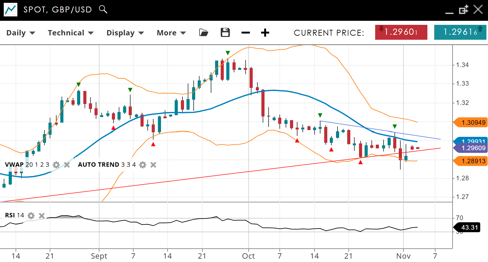 GBP/USD continues in a neutral consolidation phase with a slight bearish bias. The current price is 1.2960, close to the VWAP (20) of 1.2993. Support is at 1.2891, and resistance stands at 1.3094. The RSI is 43, showing mild downside pressure within the neutral trend.