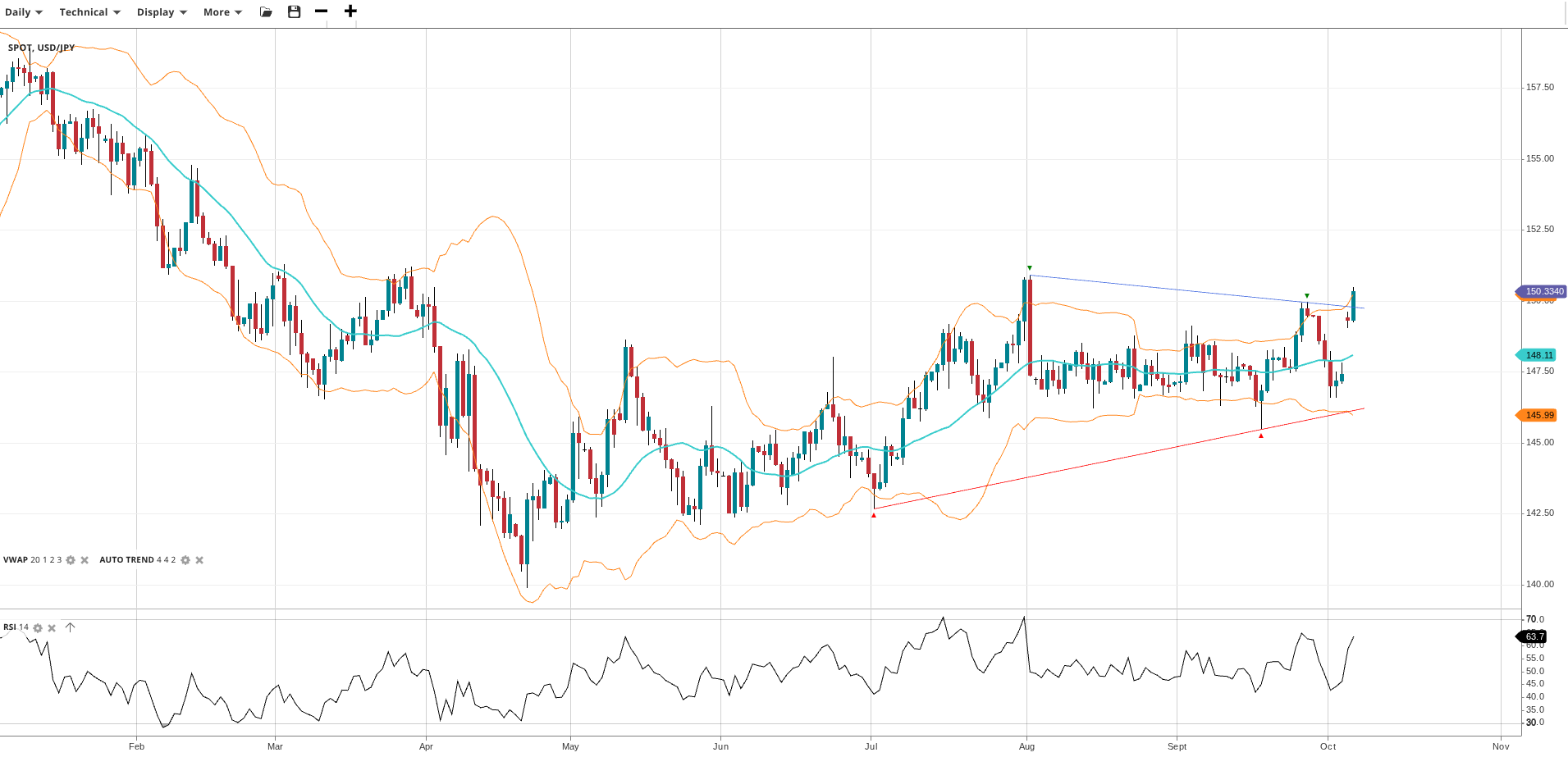 USD/JPY is attempting a breakout of its neutral range phase to set up a new uptrend, trading at 150.33 above its VWAP of 148.11. The RSI at 63.7 indicates bullish momentum building. Support is at 145.99, with resistance at the current level.