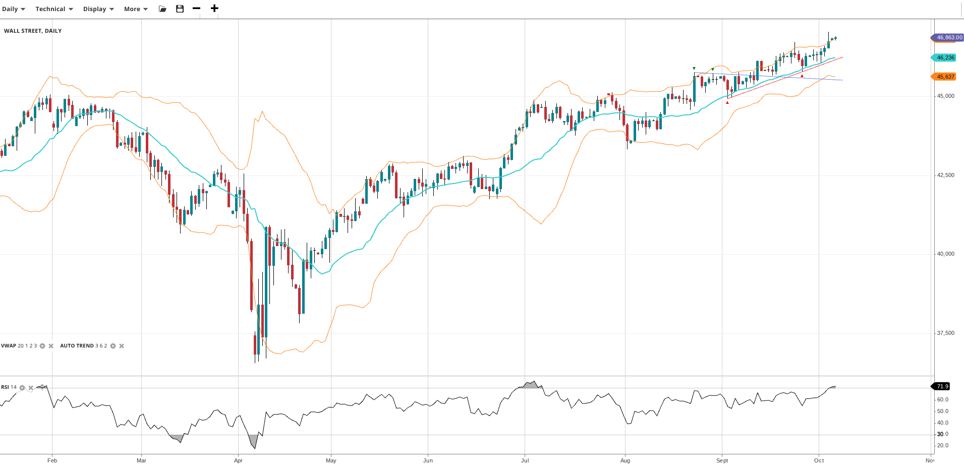 Wall Street extends its bullish impulsive phase, reaching new record highs, currently at 46,863. VWAP is at 46,236, affirming the strong trend. The RSI at 71.9 shows overbought conditions. Support is at 45,637 while resistance is untested at these highs.