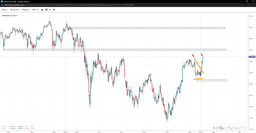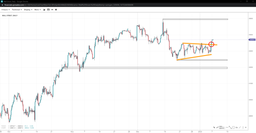 After last week’s continued sideways price action, Wall Street peaked at 33500 and could not slide below 32800. Its price action resembles a triangle, with an imminent breakout at play. 32500 is major support above 32k, but a break higher will bring the 35k handle back in focus if 34k gives in.