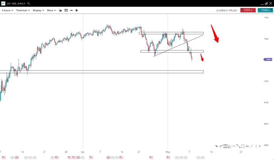 The price of GER40 posted a double top formation which led to a reversal to the downside where sellers showed strength over the buyers. This led to a breakout of the bullish trend line to the downside and now it is testing the 13555 mark. A break and close below this zone will lead to further movement to the downside, possibly to the 13,350 level.