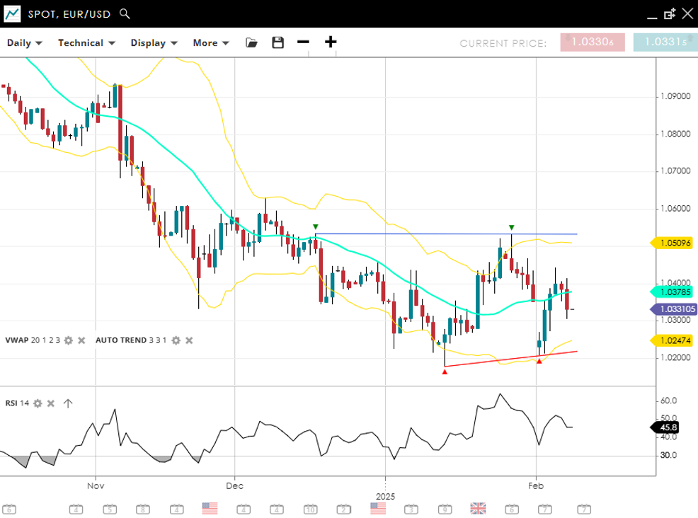 EUR/USD has entered a neutral stance, trading at 1.0331 in the middle of a 1.02 to 1.05 range, slightly below its VWAP (20) of 1.0378. The pair is consolidating with support at 1.0247 and resistance at 1.0509. RSI at 45 indicates a lack of clear directional momentum for now.