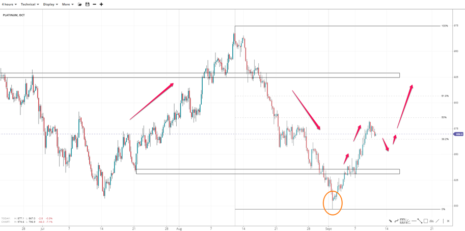 Platinum left the 800 low in the rearview mirror and eyes the golden pocket at 910. The weak attempt at the 50% retracement of the 800-975 leg near 885 suggests a pullback to the 38.2% Fibonacci near 865; but prices could slide lower. Key support lies around 830 above the 800 handle. Inversely, major resistance can be observed at 925.