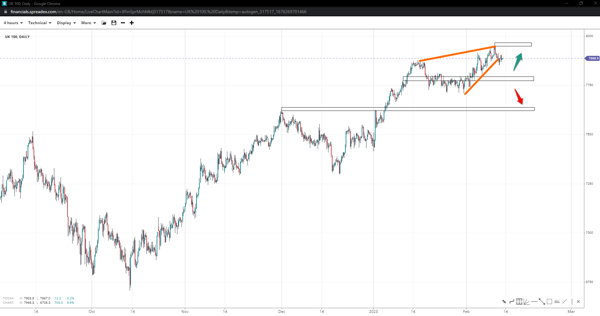 UK’s FTSE formed a wedge pattern by the record high of 7950 and pulled back to 7850 in what appears to be a correction. Falling deeper will expose 7770, with the short-term trend prevailing to 7620 if bulls fail to garner enough demand. On the other hand, we could see a bounce towards the 8k handle, implying a larger wedge pattern might be in the making.