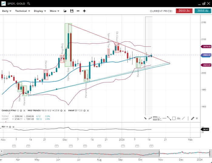 Gold remains neutral, with the price now trading back and forth around the 20-period VWAP of 2,053. Support is at 2,023, and resistance is found at 2,078. An RSI of 56 shows moderate bullish momentum without imminent overbought concerns.