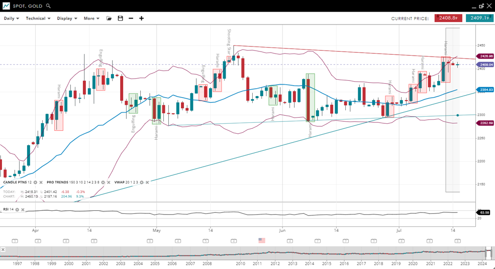 Gold remains in a sideways trend but has just broken the June peak, with the price recently increasing to 2,409, now around the previous VWAP of 2,354. Support has adjusted higher to 2,282, while resistance has increased to 2,426. The RSI has strengthened to 63, indicating the potential beginnings of a new period of higher momentum.