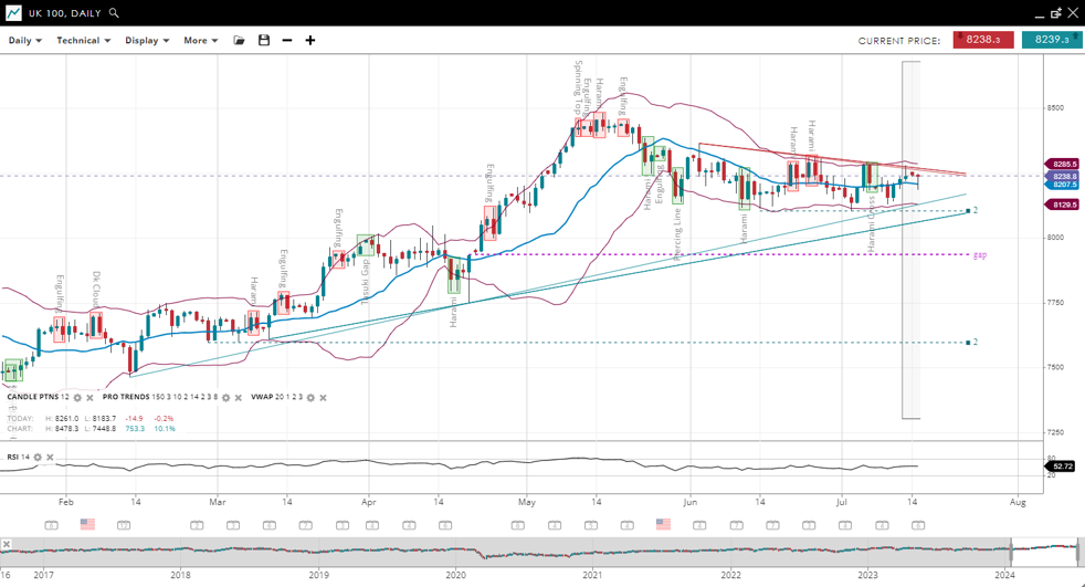 | UK 100 | Neutral | Consolidation | 8238 | 8207 | 8129 | 8285 | 52 |