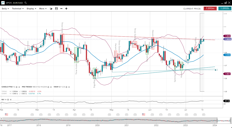 EUR/USD has broken out from its previous downtrend but the new uptrend needs to take out the June high to be sustainable. It is now well above the VWAP of 1.0783. Support has adjusted higher to 1.0637, while resistance has increased to 1.0929. The RSI has increased to 67, indicating a reduction in bearish pressure.