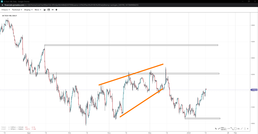 The US Tech index reached a high of 11570 early Monday and remains comfortably away from the 11k handle. Gaining traction towards the 12k could offer a breakout towards 12900 and confirm the leading wedge pattern. Otherwise, it could print a parallel channel instead and slide lower.