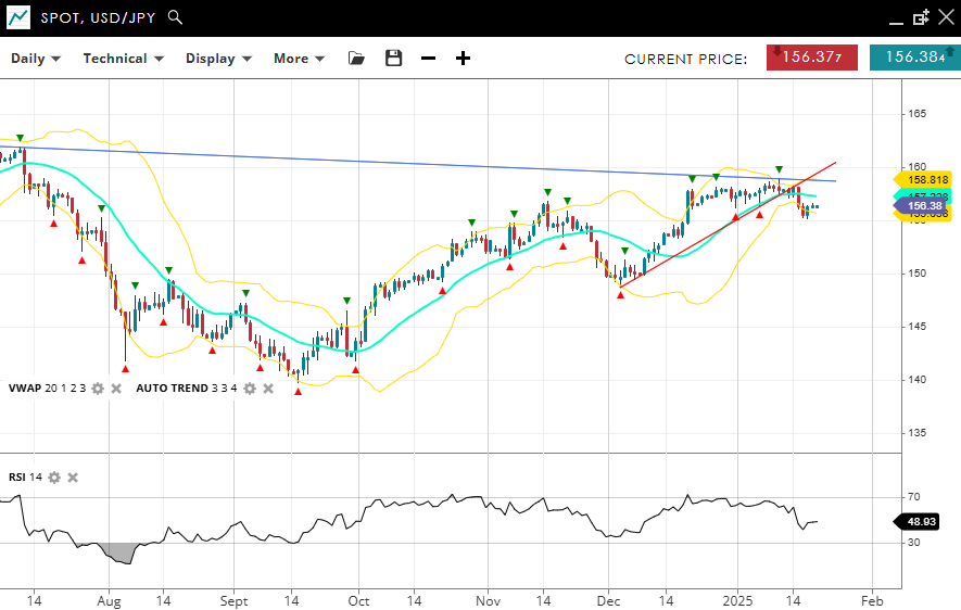 USD/JPY is in a bullish correction, trading at 156.38, slightly below its VWAP (20) of 157.33. Support is anchored at 155.03, and resistance is positioned at 158.81. The RSI at 48 denotes neutral momentum, aligning with its corrective phase.