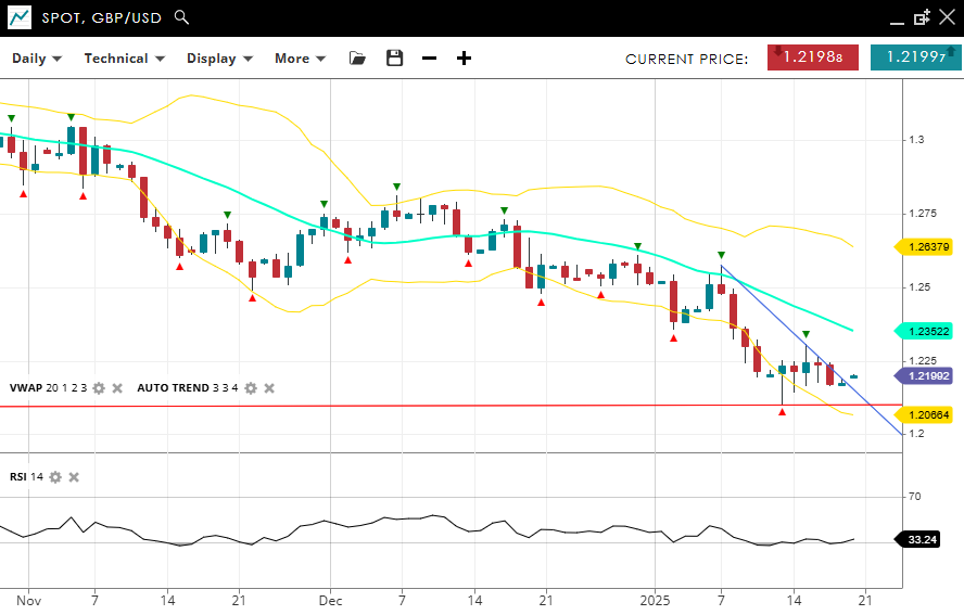 GBP/USD is entrenched in a sharp bearish impulsive move, trading at 1.2199, well beneath its VWAP (20) of 1.2352. Support is established at 1.2066, with resistance higher at 1.2637. With the RSI at 33, the pair is nearing oversold levels, hinting at potential consolidation coming next.