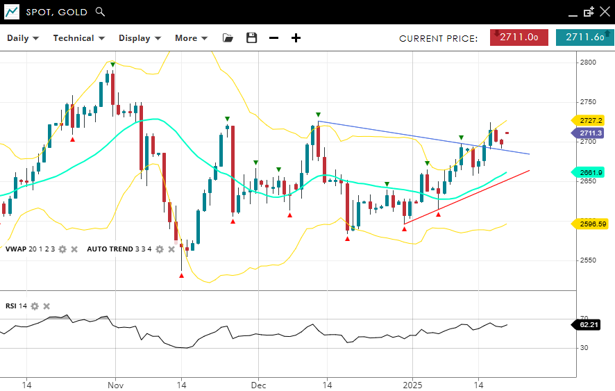 Gold’s neutral consolidation phase is just about intact after a bullish push, with prices at 2,711, marginally above its VWAP (20) of 2,661. Support is seen at 2,596, and resistance is nearby at 2,727. The RSI at 62 suggests balanced conditions, with a slight tilt toward bullish activity.