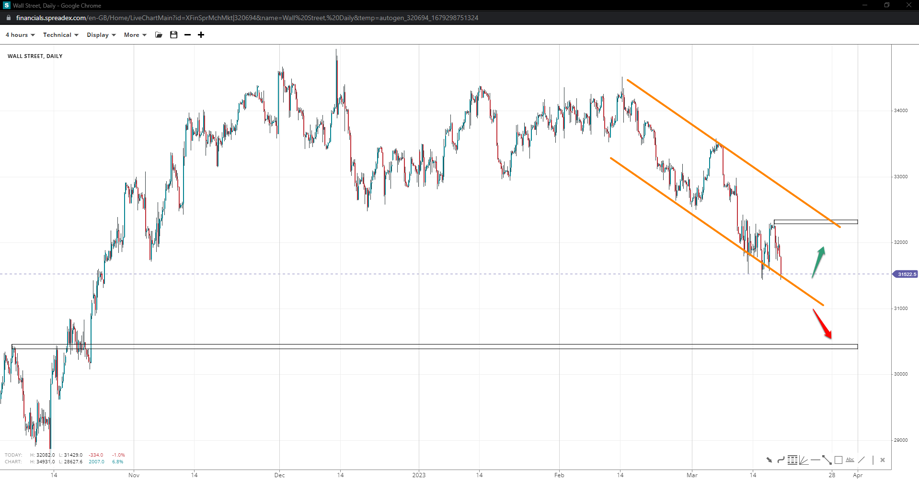 Wall Street bounced at the lower end of the descending channel, opening up the chances of some respite towards 32300 but unlikely 33k. Sliding below might expose 30500 if the base of 31k succumbs to pressure.