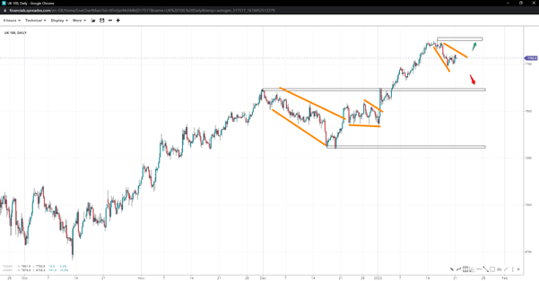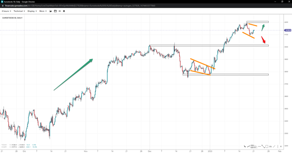 Eurostocks 50 is in a clearly defined uptrend, with the consolidation originating at 4200 forming a pennant. If the index reclaims the top, we could see the pattern come through and higher prices towards 4300. But further weakness could see a flag print instead, with the 4k handle back in the spotlight.