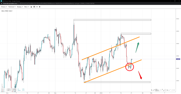 Wall Street accelerated to 34400, met stiff resistance and reversed below the base trend. The support at the 33k handle repelled bearish price action, leaving back only a failure pattern, and it is currently recovering. It could reclaim the 34k handle and upper trendline if it remains within the channel. Otherwise, slide to 32500.