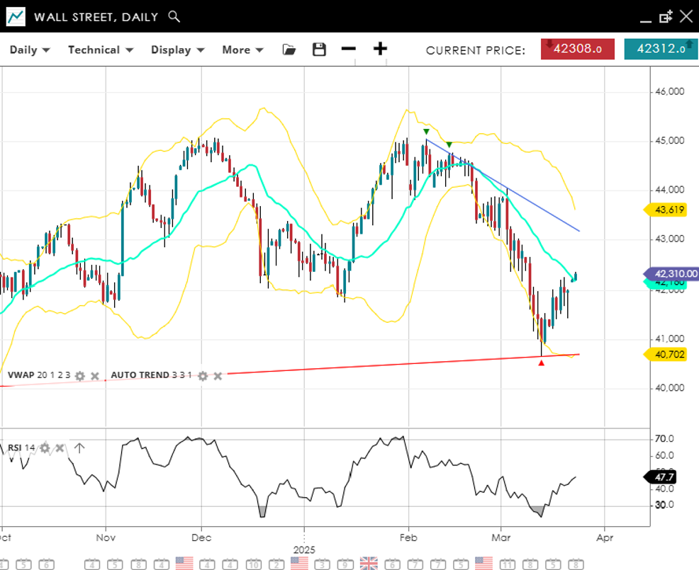 Wall Street upholds its bearish momentum but a rally of the lows puts it into a correction, currently at 42,310, hovering around the 20‐day VWAP of 42,180. With an RSI of 48, the index isn’t oversold but still faces downside pressure. Key support appears near 40,700, and any rebound may encounter resistance around 43,619.