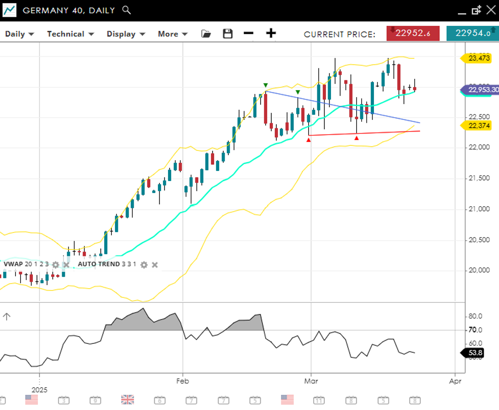Germany 40 retains its bullish trend and impulsive stance, trading near 22,954 just above the 20‐day VWAP of 22,900. An RSI of 54 suggests neutral momentum, which continues to show bearish divergence. If the index slips, 22,375 could serve as near‐term support, while a decisive break above 23,473 may open further upside.