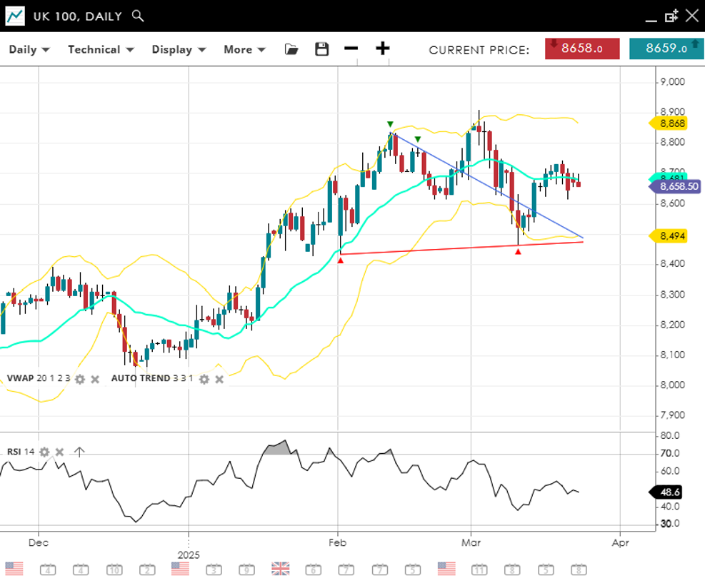 UK 100 has flipped into a neutral/sideways trend, consolidating after the Jan-Feb rally, quoted at 8,659 just below the 20‐day VWAP of 8,681. The RSI at 49 indicates muted momentum. 8,494 marks notable support if selling accelerates; on the upside, a move beyond 8,868 could signal renewed strength.