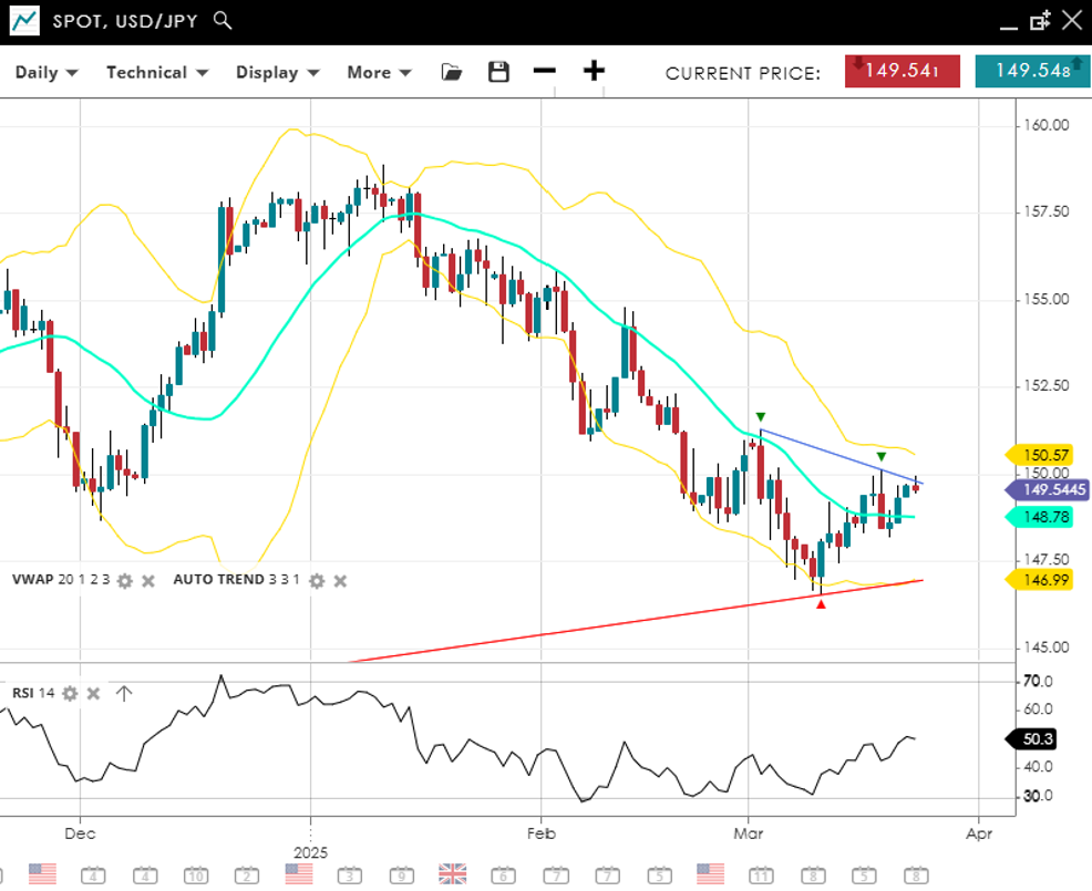 USD/JPY stays bearish but has entered a correction, printing 149.55 slightly above its 20‐day VWAP of 149.20. The RSI of 50 indicates neutral momentum. A dip below 146.99 may reinforce the downtrend, whereas moving beyond 150.57 would challenge the current bearish bias.
