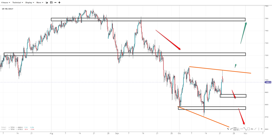 UK 100 moved past the 7000 handle temporarily without breaking past the swing high of 7100, and reversed. A slide below 6860 could clear the path to 6800, the previous low, and 6400, as it is the range of the potential broadening wedge. Only recapturing 7200 can offer a chance at 7500.