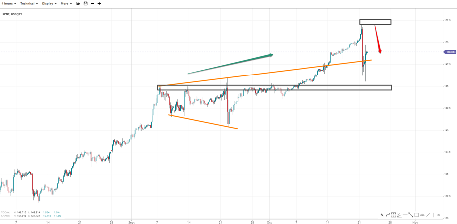 USD/JPY completed the broadening top formation at 152.00, hinting at a reversal unless 145.00 acts as a support or turns sideways. 147.50 and 149.70 are near bottom and top levels, with 152.00 and 145.50 being crucial levels for medium-term price action.