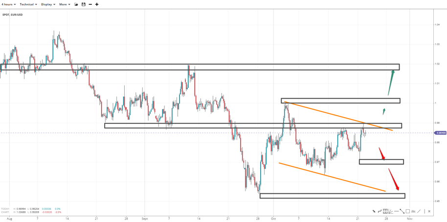 EUR/USD is between a rising flag and a potential triangle so long it remains below parity. 0.9900 is near-term resistance with 0.9700 support if 0.9800 weakens. If the descent continues, the pair might revisit 0.9537 but needs the 0.9630 break first, with the lower flag trendline also on the cards. If 0.9700 holds, the chances of printing a triangle will increase.