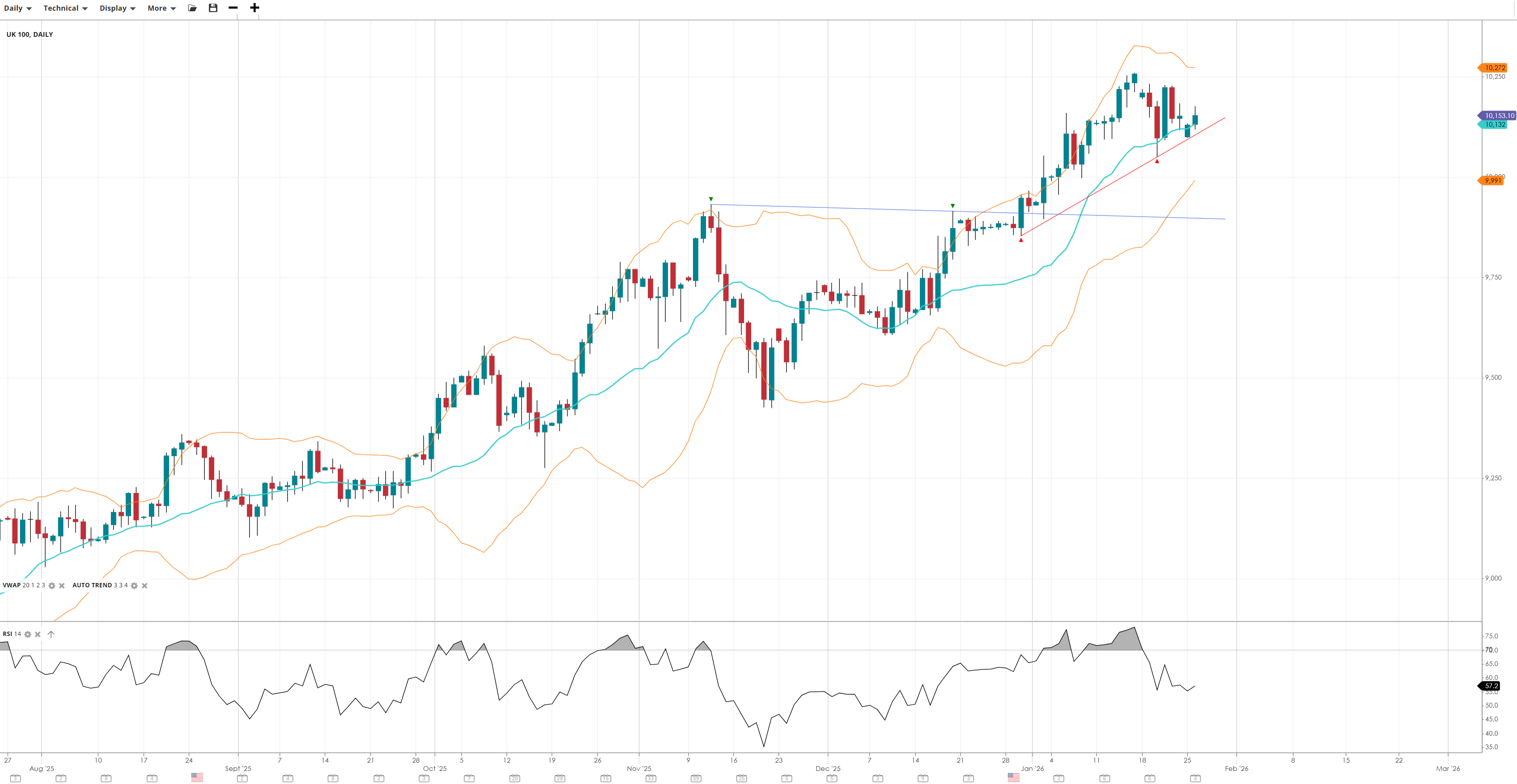 NOTE: These charts use the ‘Pro Trading Tools’ available on the SpreadEx trading platform. To use them, log in to your SpreadEx Financials Account and click ‘Technical’ from the menu on any chart.