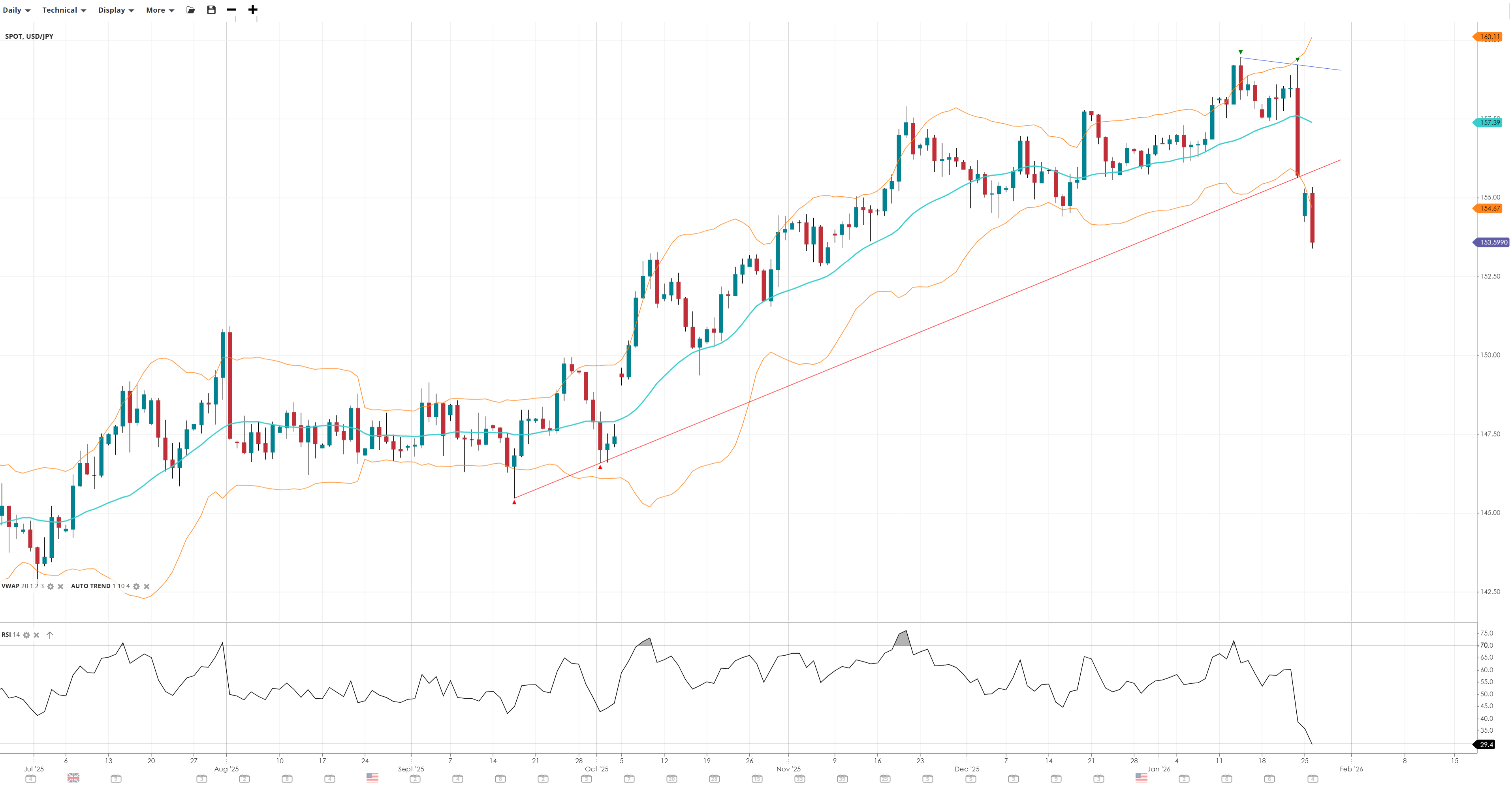 USD/JPY has broken lower in a sudden drop below up-trendline support, with price trading well below the VWAP. Momentum has slumped into oversold territory, suggesting a new bearish tilt. Support is under pressure, and resistance overhead at 160 could hold for now.
