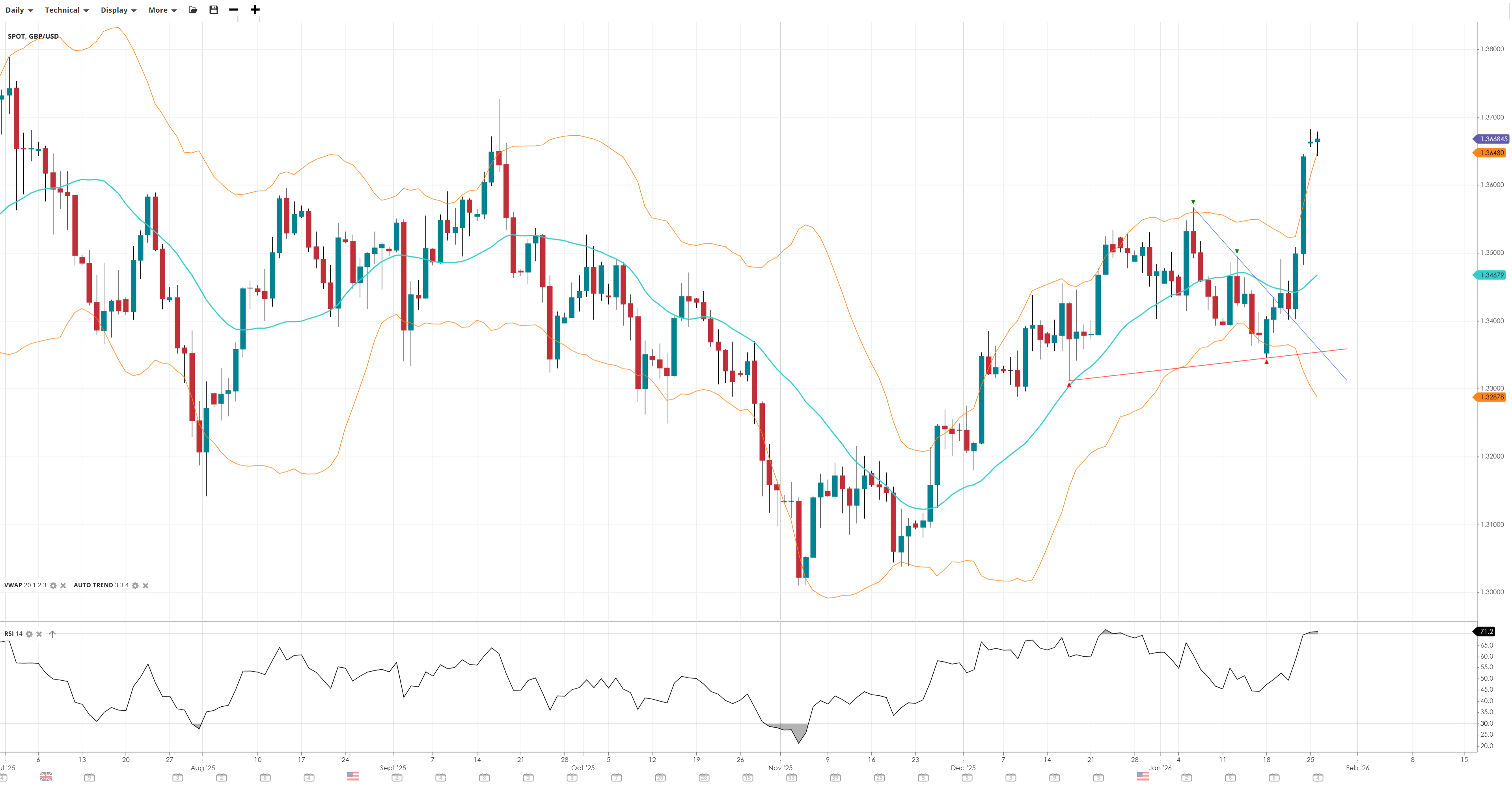 GBP/USD has made a bullish breakout after a big daily gain on Friday, leaving the price well above the VWAP. There is strong momentum, as the pair tests the highs last seen in September. Buyers are in control while the breakout holds.