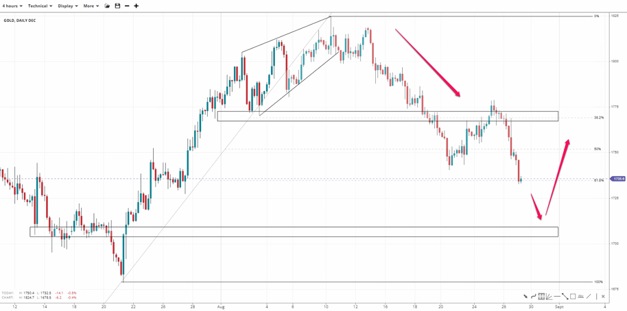 Gold trades in a clear downward trend in the near-term but found temporary support by the 1,730 golden pocket. A close below the key level would likely increase bearish bets toward 1,700. If bullish momentum rises prices could accelerate toward the 38.2% Fibonacci near 1,770. A break of the short-term resistance would bring 1,800 back on the table.