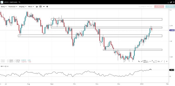 The price has stalled at 1830 for a second time in January. Two hanging men and a shooting star pattern on the daily candle chart imply a further decline but the rising RSI trendline supports higher prices.