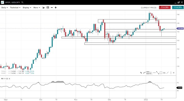 The index is consolidating after a test of the record high formed in November. For now, the uptrend is intact as the price makes higher lows and the RSI is above 50.